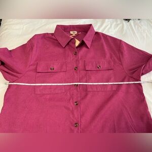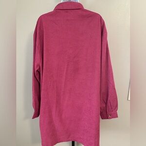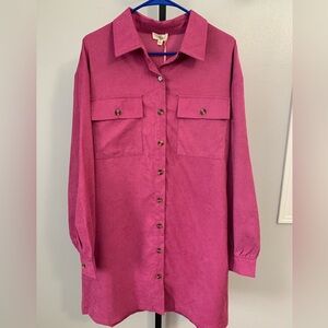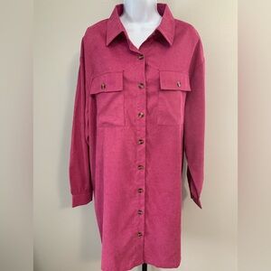 Vibrant pink collared dress/ duster by Entro. Features a classic design. Ideal for versatile styling. Full button down has pockets and button pockets on front. It is a corduroy feel. This is a great dress or wear it open as a layer. Size XL is 90% polyester, 8% nylon and 2% spandex.