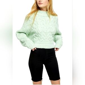 Free People Merry Go Round Cable Knit Sweater Women's XS Mint Oversized Cropped Chunky Soft & Cozy