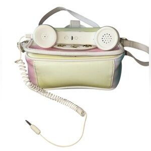 Mini plastic phone secured in top with a strap ad snap closure. Phone was meant to be plugged into your cell phone but most phones don’t have that type of plug anymore. Phone can be used as a handle