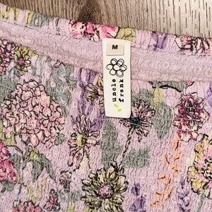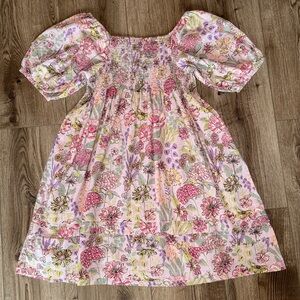 Beautiful floral dress by Uncle Frank featuring a soft pastel multicolor print. Designed with a square neckline, smocked bodice for a flattering and comfortable fit, and short puff sleeves. Lined for coverage. Flowy skirt with an easy A-line silhouette. Feminine, romantic style—perfect for spring, summer, brunch, showers, or casual events. 100% Cotton