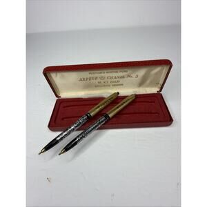 This Chanel No. 5 Arpege 14kt Gold Filigree Ballpoint 2 Pen Set is a luxurious and elegant writing instrument set that exudes vintage charm. The 14k gold filigree design on the lower barrel of the pens adds a touch of sophistication, making it a perfect gift for those who appreciate classic and timeless pieces. The Chanel No. 5 Arpege brand ensures a high-quality and unique writing experience, making this set a must-have for any collector of vintage pens.