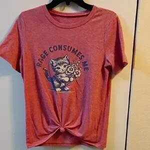Cute pink t-shirt with a cat graphic and text. Features a front knot detail.