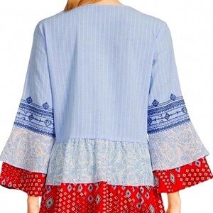 Stylish women's top featuring intricate blue embroidery and vibrant red patterns. Perfect for adding a pop of color to your wardrobe.