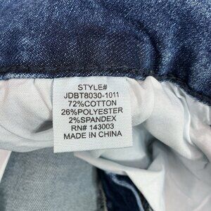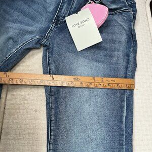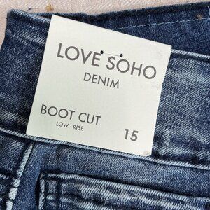 The Love Soho Jeans in women's size 15 are a stylish and comfortable choice for any wardrobe. With a high rise flared style, these blue denim stretch jeans feature a zip and button closure, along with embroidered and rhinestone accents for added flair. Made from a blend of polyester, spandex, and cotton, these jeans have a mid-rise and come in a flattering 5-pocket design. Perfect for spring, summer, and fall, these Love Soho Jeans are a versatile option for any casual look.