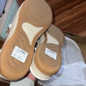 Comfortable Clarks loafers in brown. Features soft cream accents. Ideal for everyday wear.