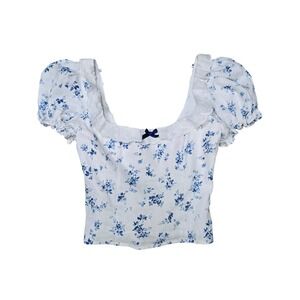 Reformation White Blue Floral Puff Sleeve Square Neck Smocked Crop Top Size 2