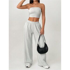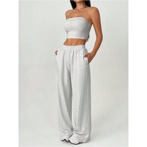Women's Petite 2 Piece Outfits Tube Top Wide Leg Pants Set Tracksuit