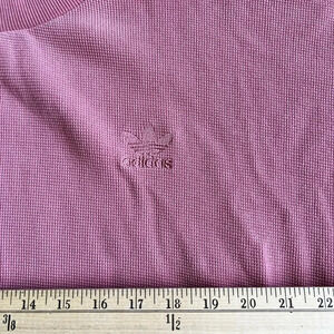 Adidas oversized top, size XL. Peach color with a waffle weave, classic adidas tone on tone stripes down the sleeves. This has two pockets, one on each side. In good pre loved condition, no rips or tears. There are two spots on the front , please see pictures. 100% cotton