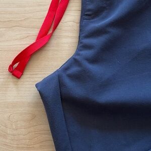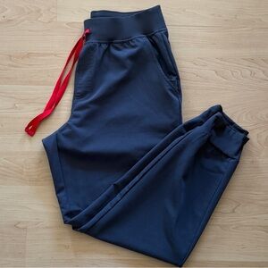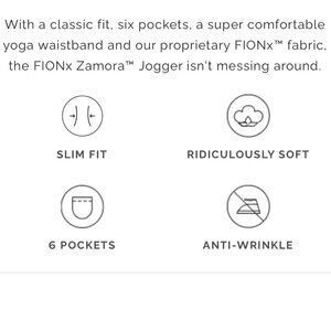 Six pockets. Yoga waistband with adjustable drawcord. Ribbed ankle cuffs. 72% polyester, 21% rayon, 7% spandex. Waist is approximately 30”. Front rise is approximately 12”. Inseam is approximately 28”. First four pictures are online stock photos.