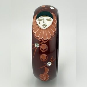 This is a rare Galalith bracelet bangle with a pierrot or clown carved design. The stunning piece features a chunky domed shape with deep eggplant purple color and a black and white contrasting carved design. The bracelet is adorned with a refined pierrot figure. All around the bracelet, various geometric carved elements, stars, and crescents complete the decor.
