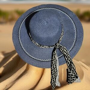 This elegant blue women's hat features a stylish black and white ribbon, perfect for adding a touch of sophistication to any outfit. Ideal for sunny days, this accessory combines fashion and function effortlessly.