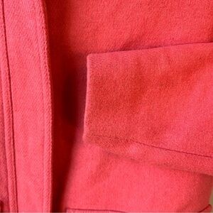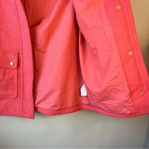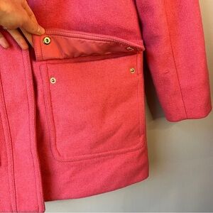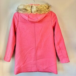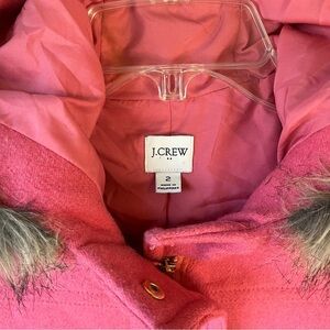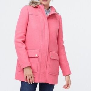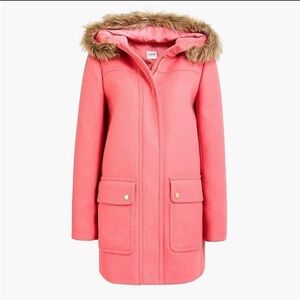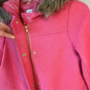 Beautiful Pink J. Crew Factory wool blend Vail Parka Winter Pea Coat in swing silhouette and faux fur hood. This classy piece features double pockets, both side and a brass button closure pocket. Front closure has both zip and snap closure for extra warmth! Fully lined.