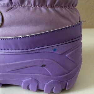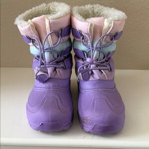 Stylish girls winter boots in purple and pink. Features cozy lining and durable soles. They are used and have signs of wear on them.