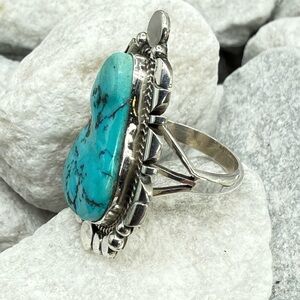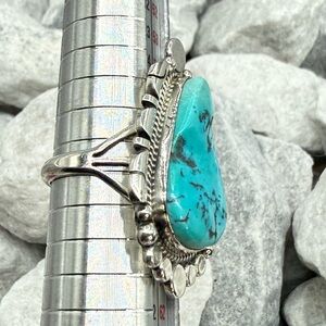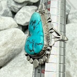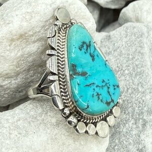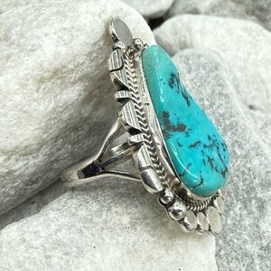 The substantial sterling silver split-shank band provides excellent balance and comfort, while the bright blue turquoise delivers that unmistakable Southwest wow factor. A true statement ring—perfect for collectors of authentic Native American jewelry or anyone who loves bold turquoise.