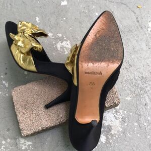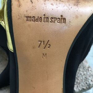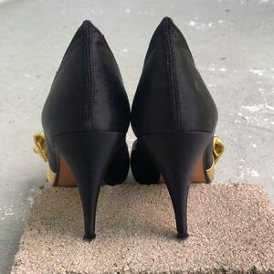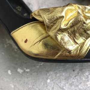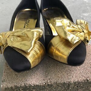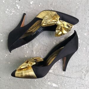 Black satin with gold bows, super cute, vintage, disco heels. Please look at the pictures need a drop of gold on a spot that I show in pictures. Heel height is 3.25.
