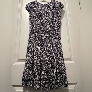 Elegant high low dress with floral print. Cap sleeves and flattering fit. Ideal for any occasion.