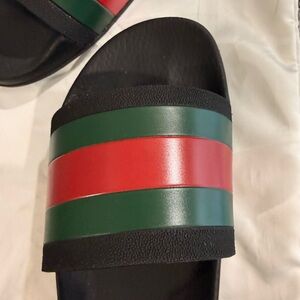 Stylish Gucci slide sandals. Features black base with red and green stripes. Perfect for casual wear.