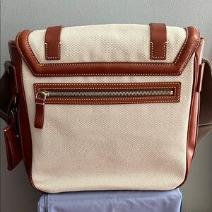 Stylish cream canvas with brown leather trim. Perfect for everyday use. Timeless shoulder bag design. Excellent condition used once. Navy canvas lining, multiple pocket adjustable strap