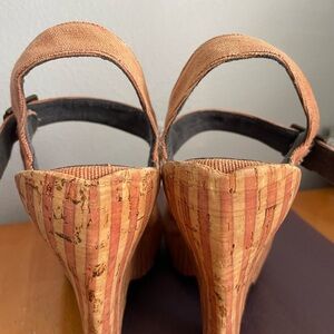 John Fluevog apricot pindowns Raquel cork wedges size 11. Great condition. Small mark on top of right shoe shown in picture.