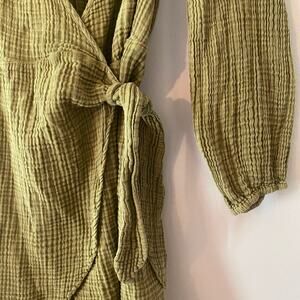 Anthropologie Women's size XS Olive Green V-Neck Wrap Long Sleeve Mini Dress. Anthropologie brand women's mini dress in a size XS. Olive green colorway. Wrap dress, tie at the waist. V-neck neckline. Fabric is 100% cotton, lightweight. Measurements as pictured. In great pre-owned condition, see photos for more details. Always feel free to ask any questions you may have! Reasonable offers accepted.