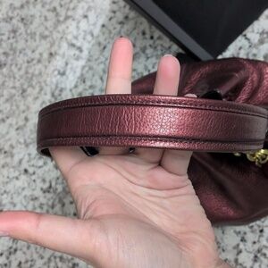 - Gorgeous full grain leather in a bold metallic red (see all photos, color shifts slightly in different lighting) with gunmetal logo and hardware.
