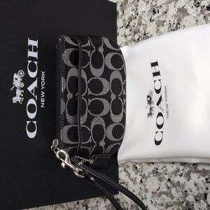 - Black and Silver lurex satin signature jacquard wristlet wallet is 6" x 4" with one zip main pocket and one outer slip pocket.