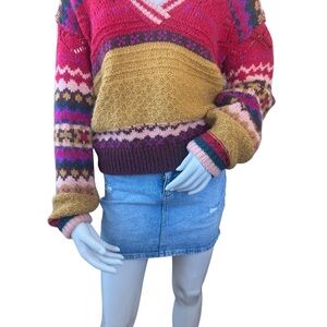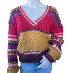 Sundance Multicolor Striped Fair Isle Rainbow Chunky VNeck Wool Blend Sweater XS