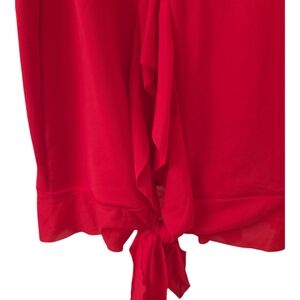 Unique tie detail and flattering V-neckline. Beautiful red color and ruffle hem.