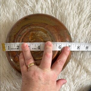 Opening is approx 5.5 inches, widest part is about 7 inches, height is about 4 inches.