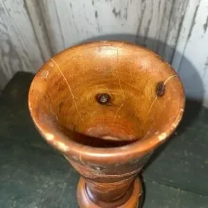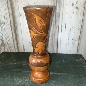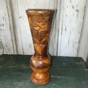 Vintage MCM Wooden Vase With Carved Leaves and Flowers 9" Tall