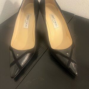 Originally retailed for $695+. Priced to sell! Elevate your wardrobe with these authentic Jimmy Choo pointed-toe heels in European size 38.5 (US 8.5). These elegant pumps feature a luxurious mix of embossed snakeskin-textured leather and suede in a sophisticated black-on-black design with crossover detailing at the toe.