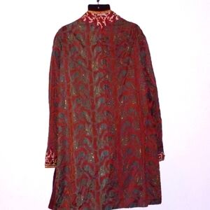 This amazing Mantra Ethics Kurta (shirt/top only) is a stunning statement. 46 Long. Made of a thick, textured silk fabric, featuring a mix of burgundy, green and gold with hand-embroidered, beaded/crystallized accents. Dry clean only. In great, gently-used condition.