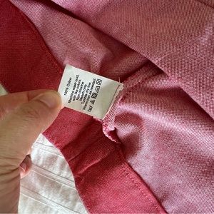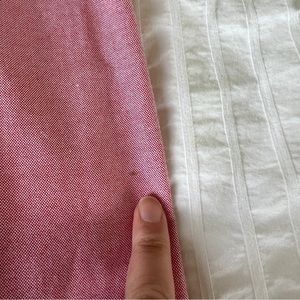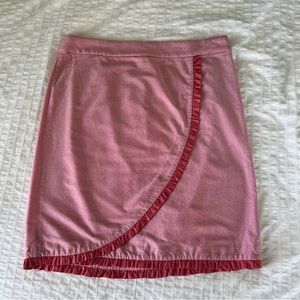 Oxford Nantucket Ruffle Pencil Skirt from J. Crew. 100% Cotton. Tailored Pencil silhouette. Sits at waist. Falls below knee. Back zip. Unlined. Colours are red and pink. In EUC, one tiny stain on one side that doesn’t really show. Size 12.