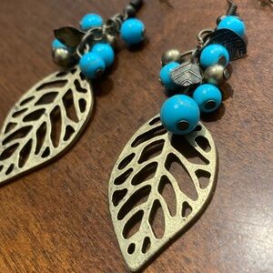 Elegant earrings featuring a leaf design with vibrant turquoise accents. Perfect for adding a pop of color to any outfit.