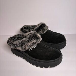 Skechers Sz 7 Shindigs Black Leather Faux Fur Lined Slip On Clogs Shoes Fortress