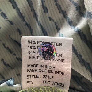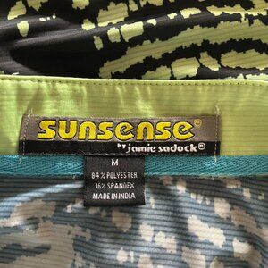 The Jamie Sadock women's Sunsense Aftershock long sleeve quarter zip golf shirt in size M is a versatile and stylish piece perfect for active women. Made from polyester, this shirt features a stand-up collar and a 1/4 zip closure for easy wear. The multicolor striped pattern adds a fun and sporty touch, ideal for both casual and activewear occasions. With its regular fit and comfortable fabric wash, this shirt is perfect for year-round wear on the golf course or for any outdoor activity.