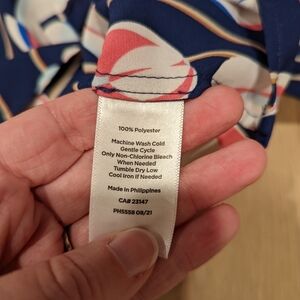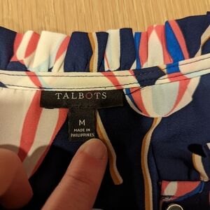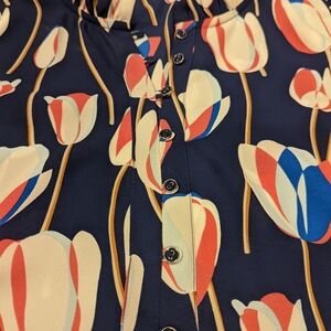 Stylish long sleeve blouse with a vibrant floral pattern. Features a mix of blue and white colors.