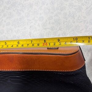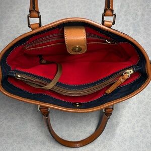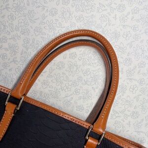 Classic Dooney & Bourke tote crafted in deep blue embossed leather with a python / reptile-style texture, accented by rich tan leather trim and handles. This structured tote blends timeless design with a subtle statement texture that elevates everyday outfits.