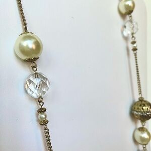 This stunning necklace features a delicate gold chain interspersed with polished gold, faux pearl, clear and rhinestoned filgree beads, creating a captivating and elegant look. The beads are thoughtfully arranged along the chain, offering a unique and stylish design.