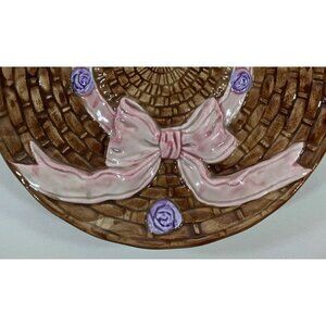 This vintage handcrafted ceramic plate features a detailed basket weave pattern, pink ribbon bow, and floral accents. Ideal for display or collecting.