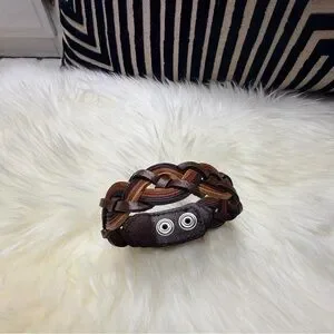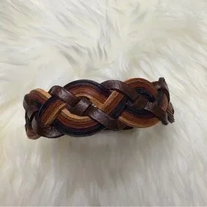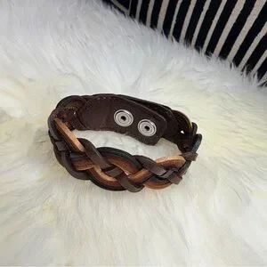 Stylish braided leather bracelet with a mix of rich browns. Adjustable snap closure.