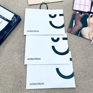 Collection of 10 shopping bags from various brands including Skims, Victoria's Secret (2), Polo Ralph Lauren, Vineyard Vines, Nordstrom (3), Gilly Hicks, and J.Crew. All in new condition straight from the stores.