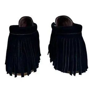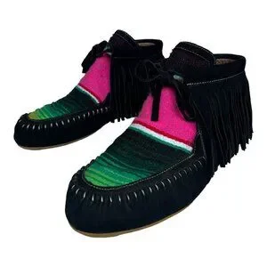 Stylish L&B black leather serape moccasins for women. These new without tags shoes offer a comfortable fit and a unique design, perfect for adding a touch of boho chic to any outfit.