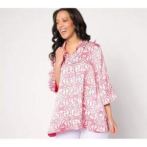Dennis Basso Women's Top Sz L Printed Button-Front Tunic -Sleeves Red A644442
