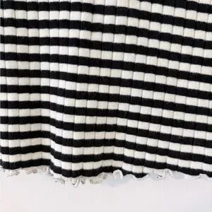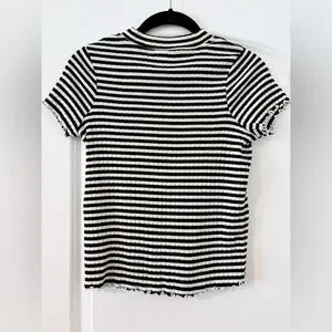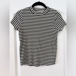 Stylish black and white striped tee. Perfect for casual outings. Soft and comfortable fabric.