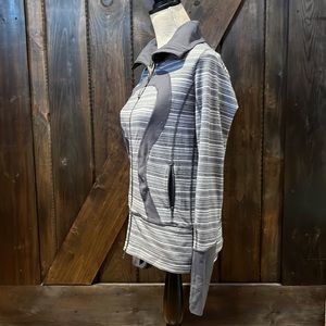 Lululemon grey and white full zip high collar long sleeve workout warm up. Size 6. Shows wear through piling started gently in a few areas. General wash wear-paint started to chip on zipper dongle. Still lots of life.