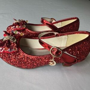 Sparkling red glitter Mary Jane shoes. Features colorful embellishments and a gold buckle.