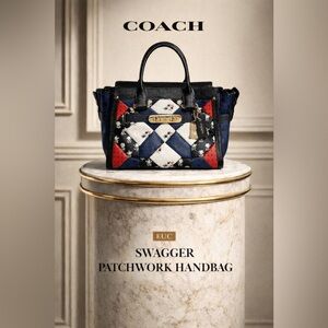 Chic Coach Swagger satchel with floral patchwork design. Features bold red, blue, and black hues.