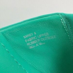 The Rainey Toe-Loop Sporty Slide Sandals by Donald Pliner, in green. Neoprene fabric upper, with a cushioned footbed, and rubber sole. The heel is about 2 inches. Size 8. Gently used.