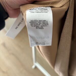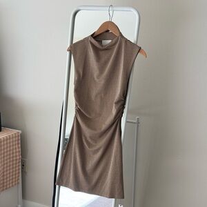 Reformation Alden mini dress in gold shimmer. The Alden is a mini length dress with a mockneck. It features side ruching for a slightly fancier look. It's slim fitting throughout to show off your figure